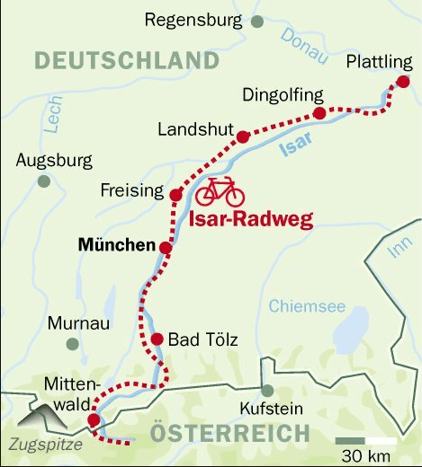 So präsentiert sich der Beginn Ihrer Isar-Radreise im österreichischen Scharnitz. Zahlreiche sehenswerte Ortschaften reihen sich wie Perlen am Isarufer aneinander: das Bilderbuch-Städtchen Mittenwald, das malerische Bad Tölz, München, die Hauptstadt mit Herz, oder die schmucken Städte Freising und Landshut, um nur einige zu nennen. Das eindrucksvolle Alpenpanorama wechselt in ein liebich-hügeliges Alpenvorland, das wiederum von der erholsamen Stille der Isarauen hinter München abgelöst wird. Na dann, nichts wie rein ins Radvergnügen!