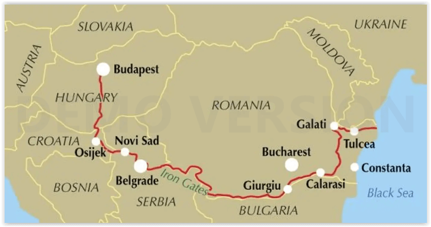 Budapest, Fishermen's bastion, St Mathias church, Europe's largest synagogue, Liberty monument, Kopacki Rit nature reserve, Osijek, Tvrda fortress, Vukovar civil war memorials, Novi Sad, Petrovaradin fortress, Belgrade, Kalemegdan fortress, St Sava cathedral, Golubac castle, Iron Gates gorges, Golubacki klisura, Gospodin vir, Veliki Kazan, Mali Kazan, rural Romania, Dervent monastery, Tulcea, Danube Delta.