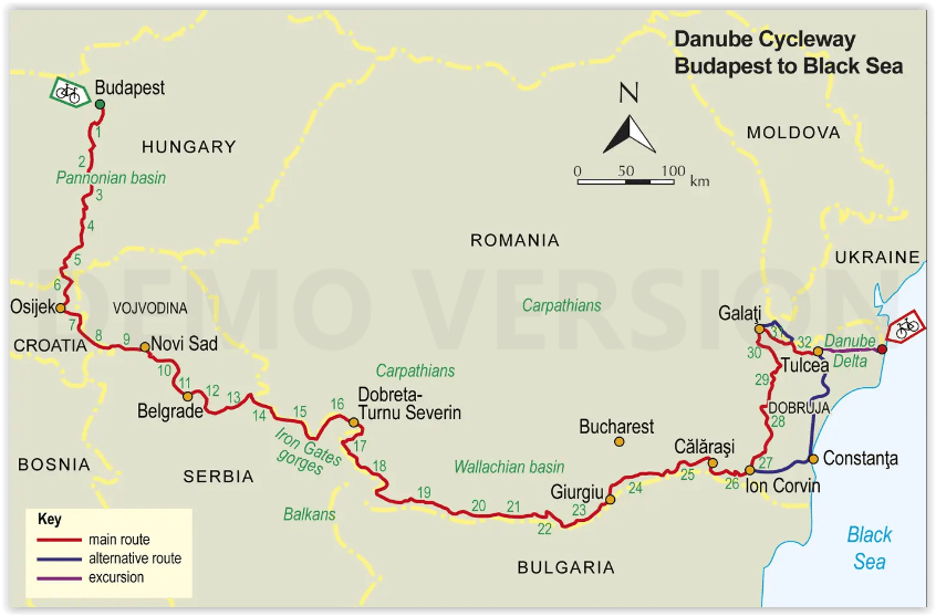Although the route is mostly level, with a few gentle gradients, it is a challenging ride due to the lack of tourist infrastructure, particularly in Romania. There are long distances between places offering accommodation and refreshments, almost no tourist offices or cycle repair shops, and very few rural Romanians speak west European languages. There are long stretches in Hungary and Serbia along unsurfaced flood dykes, although alternative routes are given to allow you to avoid these stages. Otherwise surfaces are mostly asphalt and in good condition, suitable for hybrid or touring cycles.