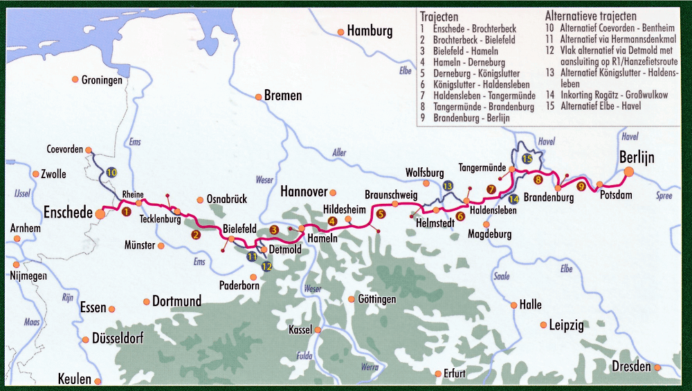Vers van de pers is de gids ‘Fietsen naar Berlijn’ met een compleet nieuwe route, die vanaf Enschede of Coevorden via het Teutoburgerwoud, Hamelen, Braunschweig, Brandenburg en Potsdam naar Berlijn loopt. Onderweg worden andere bekende fietsroutes gekruist, zoals de Europaradweg R1 , de Hanzefietsroute, de Weserradweg, de Elberadweg en de IJzeren Gordijnroute (Eurovelo 3).