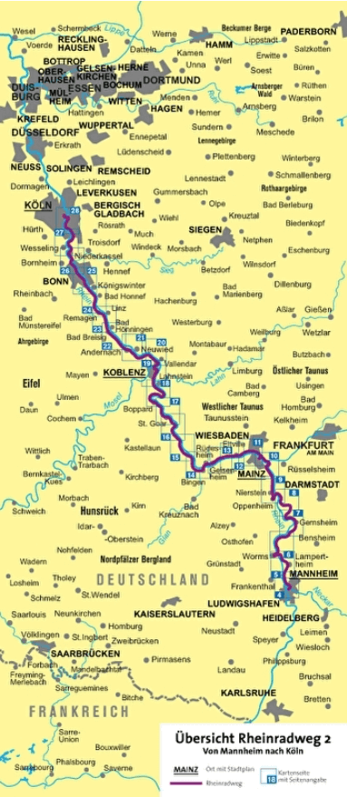 * Vijf miljoen mensen wonen in de agglomeraties tussen Mannheim/Mainz en Keulen/Bonn. Toch kunt u langs deze fietsroute keer op keer weelderige natuur ontdekken. Tussen Mannheim en Mainz vindt u vlakke natuurgebieden, lussen van de Altenrhein en dijkroutes. Tussen Mainz en Koblenz ligt een pittoreske wijn- en kastelenregio. In de agglomeratie Keulen kenmerken parken en promenades de routes langs de Rijn. De vele wijnsteden, zoals Oppenheim, Rüdesheim en Bingen, zijn bijzonder charmant langs de Rijnfietsroute.
