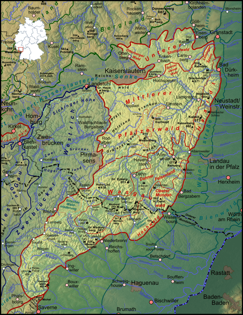- De Duitse STREKEN: Pfälzer Bergland, Saarland Duitsland, Pfälzerwald, Rijnland-Palts Duitsland