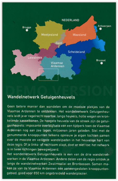 Getuigenheuvels Vlaamse Ardennen wandelnetwerk Productomschrijving: Wandelen en genieten langs veilige en aantrekkelijke paden, langs een parcours dat je zelf uitstippelt? Het kan in het gol...