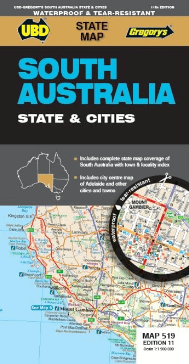 It includes a state map and index to towns and localities at a scale of 1 : 1 900 000 and state touring information. In addition to this, there is a map covering 150km around Adelaide including the Yorke & Fleurieu Peninsulas and Kangaroo Island at a scale of 1 : 100 000 and street level mapping for Adelaide City and Coober Pedy, Hahndorf, Kangaroo Island, Murray Bridge, Nuriootpa, Renmark and Victor Harbor.