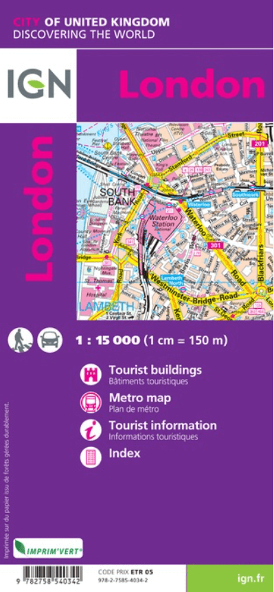 Wegenkaart Londen England - IGN Productomschrijving: Deze wegenkaart omvat het volledige London (England) op schaal 1:15.000 (1 cm = 150 m), hij bevat alle touristische wegen als ook Nationa...
