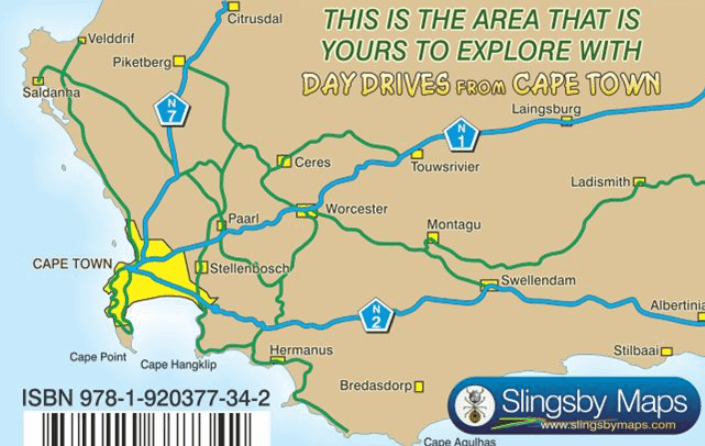 Productomschrijving: Day Drives from Cape Town. Our Day Drives from Cape Town map is the most comprehensive map available of the heartland of the Western Cape. The map shows all the roads, towns and relief of the area from Cape Town north to Citrusdal, north-east to Laingsburg and east to Stilbaai /