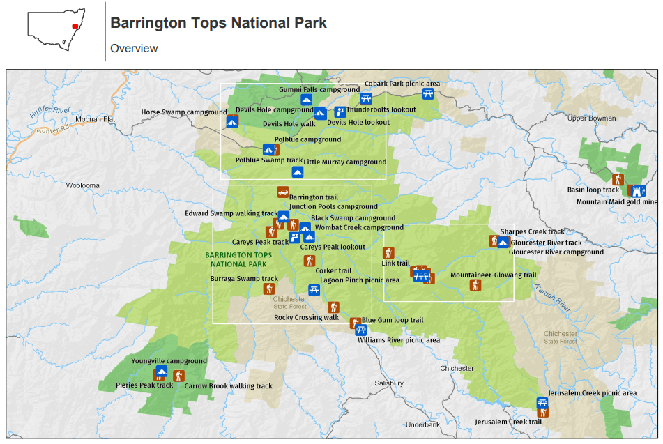 - Detailed map of Barrington Tops National Park (at 1:100,000 scale)