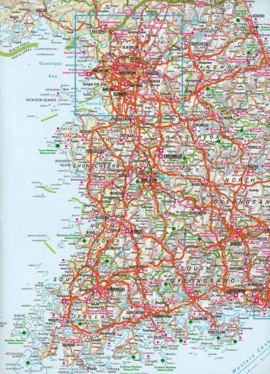 Deze kaart omvat: Noord & Zuid Korea, Pyongyang, Central Busan, Incheon, Greater Busan, Jeju Island, Gyeongju & Namsan.