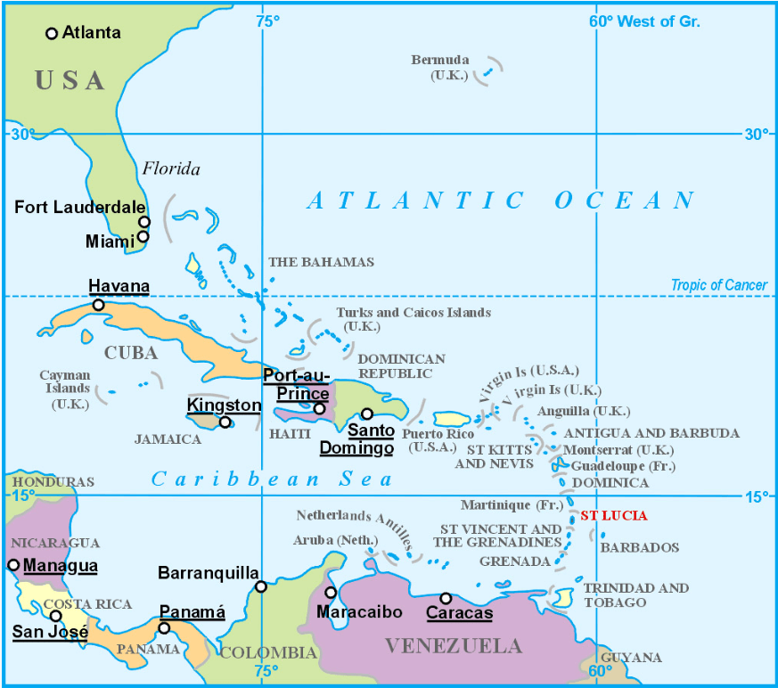 - De Caraïbische eilanden: Saint Lucia, Caraïben