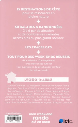 - 15 destinations de rêve pour se ressourcer en pleine nature - Plus de 70 balades et randonnées- 4 à 5 par destination - et de nombreuses variantes accessibles au plus grand nombre - Les traces gps téléchargeablesEt toutes les infos pour des week-ends réussis: Une sélection d'hébergements - D'autres expériences outdoor - Des suggestions d'autres balades alentour - Diverses infos patrimoniales - Les astuces rando Lozère - Margeride - Cévennes - Pont-de-Montvert - Meyrueis - Villefort - Gard - Saint-Jean-du-Gard - Le Vigan - Hérault - Lac de Salagou - Saint-Jean-de-Buèges - Saint-Guilhem-le-Désert - Massif du Caroux - Aude - Minervois - Pays Cathare - Pyrénées-Orientales - Prades - Ille-sur-Têt - Mont-Louis - Font-Romeu - Côte Vermeille - Argelès-sur-Mer - Banyuls-sur-Mer