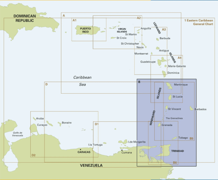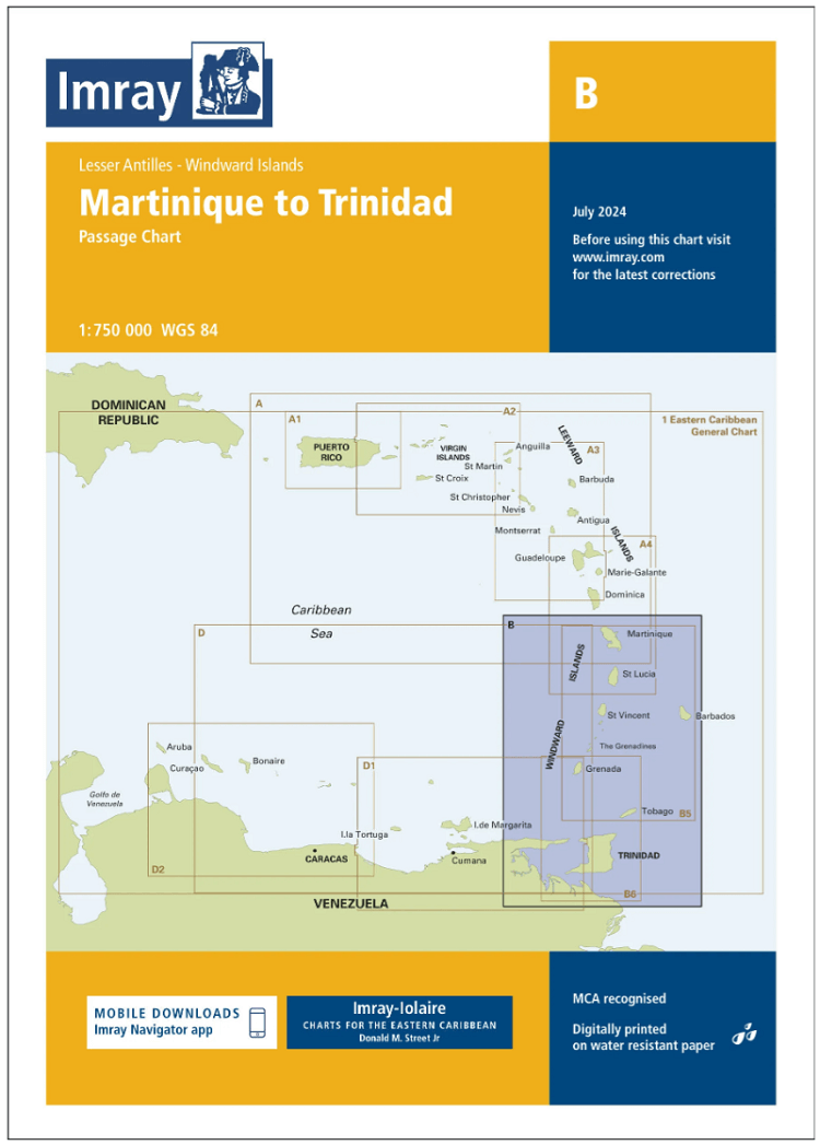 De Imray B-serie van Iolaire-kaarten bestrijkt de Caribische Bovenwindse Eilanden van Martinique tot Tobago, inclusief Barbados.