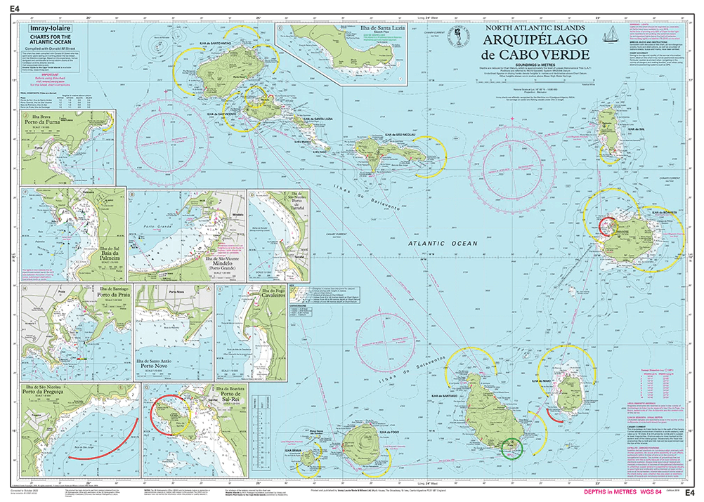 Imray-Iolaire-kaarten voor "Arquipélago de Cabo Verde"-"Kaapverdische archipel" worden algemeen erkend als de beste kaarten voor zeilers. Ze combineren de nieuwste officiële digitale metingen met informatie uit de eerste hand die is verzameld tijdens meer dan 60 jaar onderzoek door Don Street Jr en zijn uitgebreide netwerk van medewerkers. Net als alle Imray-kaarten zijn ze gedrukt op waterbestendig Pretex-papier voor extra duurzaamheid en bevatten ze veel ankerplaatsen, voorzieningen en inhammen die niet op officiële kaarten staan. Deze editie bevat de nieuwste officiële digitale gegevens in combinatie met aanvullende informatie uit het netwerk van Imray, waardoor deze kaart ideaal is voor kleine vaartuigen. De kaart bevat de nieuwste officiële bathymetrische metingen. De kaart is volledig geactualiseerd.