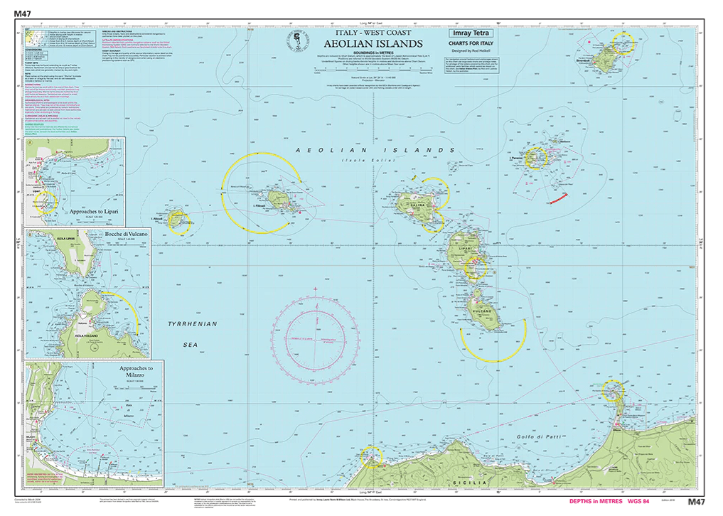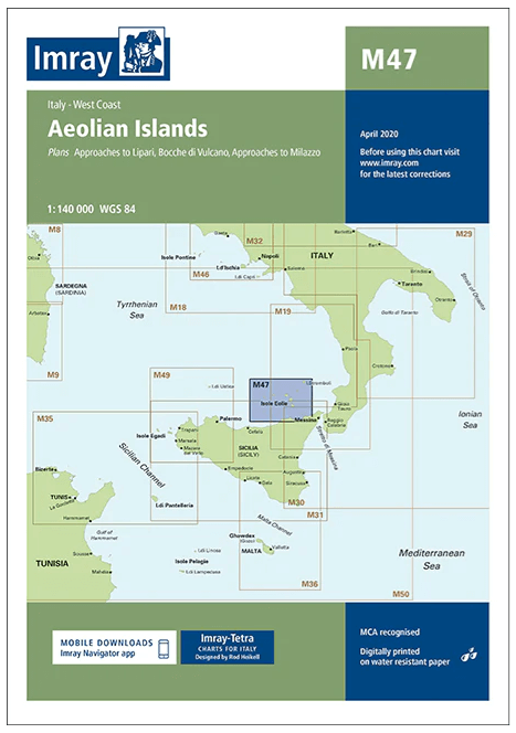 De Imray Charts M-serie voor de Middellandse Zee biedt dekking van populaire gebieden op kaarten die speciaal zijn ontworpen voor de behoeften van zeilers. Geschikt voor het plannen van routes en grotere kaarten voor het navigeren in kustwateren, zelfs dicht bij de kust. De kaart bevat de nieuwste officiële UKHO Digital-gegevens, gecombineerd met aanvullende informatie uit het netwerk van Imray, waardoor deze ideaal is voor kleine vaartuigen. De kaart is volledig herzien. Imray-Iolaire-kaarten voor "Aeolian Islands" worden algemeen erkend als de beste kaarten voor zeilers.
