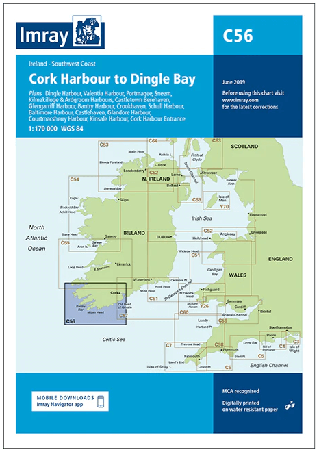 Imray-Iolaire-kaarten voor "Cork Harbour to Dingle Bay Westcoast Ireland" worden algemeen erkend als de beste kaarten voor zeilers. Ze combineren de nieuwste officiële digitale metingen met informatie uit de eerste hand die is verzameld tijdens meer dan 60 jaar onderzoek door Don Street Jr en zijn uitgebreide netwerk van medewerkers. Net als alle Imray-kaarten zijn ze gedrukt op waterbestendig Pretex-papier voor extra duurzaamheid en bevatten ze veel ankerplaatsen, voorzieningen en inhammen die niet op officiële kaarten staan. Deze editie bevat de nieuwste officiële digitale gegevens in combinatie met aanvullende informatie uit het netwerk van Imray, waardoor deze kaart ideaal is voor kleine vaartuigen. De kaart bevat de nieuwste officiële bathymetrische metingen. De kaart is volledig geactualiseerd.