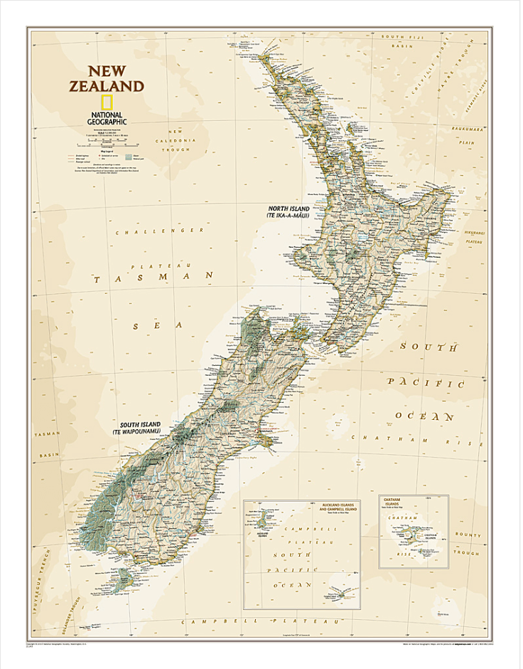 Productomschrijving: The reference map of New Zealand uses National Geographic's Executive style with an antique-style color palette and stunning shaded relief. The map shows this island nation in great detail, from the subtropical North Island (Te Ika-a-Maui) to the glacial carved valleys of Fiordland on the South Island (Te Waipounamu). The North Island is best known for large volcanic lakes and the cities of Auckland and Wellington. The South Island is famous for the Southern Alps that run along the spine of the island. The highest point in the country is Aoraki (Mount Cook) and is found in the Southern Alps.
