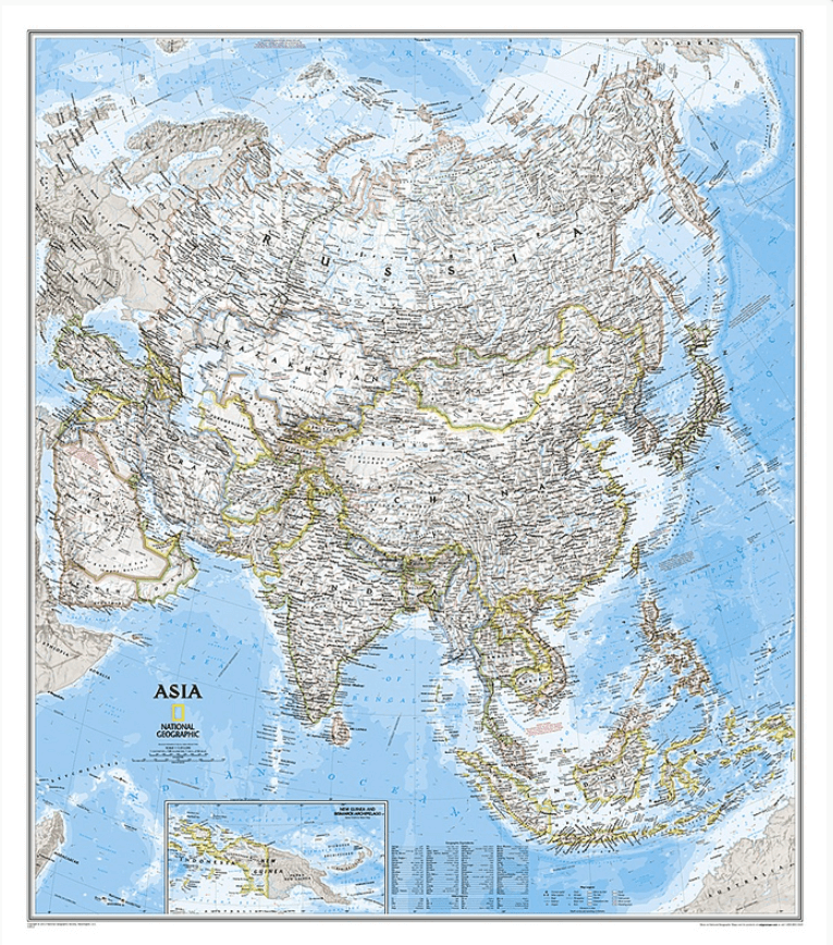 Wandkaart Azië 84 x 96 cm - Nat Geo Productomschrijving: National Geographic's map of Asia is as attractive as it is functional. The entire continent is rendered in the Classic style with co...