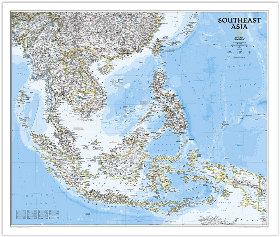 Wandkaart Zuidoost-Azië - Nat Geo Productomschrijving: National Geographic's Classic style political map of Southeast Asia features clearly defined international boundaries, thousands of pla...