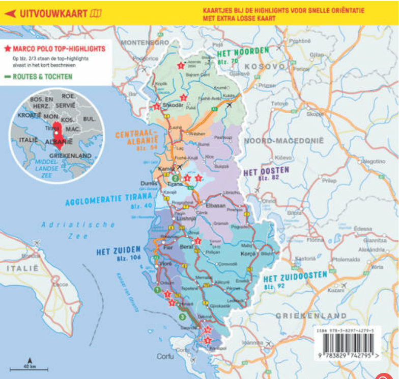 Productomschrijving: Marco Polo reisgids voor Albanië! Handig pocket formaat, boordevol informatie, met uitneembare kaart achter in het boek en plattegronden verspreid door de gids. Met Bucketlist, ‘insider tips’ om dit land in de Westelijke Balkan écht te ontdekken, de TOPlijst van bezienswaardigheden in één oogopslag, up-to-date informatie in overzichtelijke hoofdstukken: sightseeing, eten & drinken, winkelen, uitgaan, verblijf, routes & tochten, voor kinderen, feesten, festivals & evenementen, internet tips, praktische info van a tot z, een taalgidsje, plattegronden en straatnamenregister.
