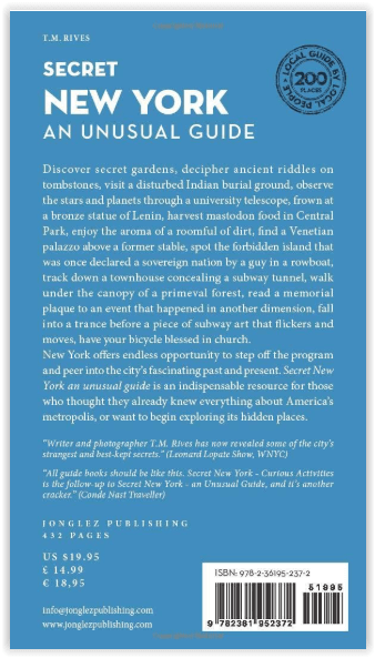 The places included in our guides are unusual and unfamiliar, allowing one to step off the beaten track. Now in it's third edition, Secret New York - An Unusual Guide features 200 secret and unusual locations. Inside Secret New York - An Unusual Guide : Admire an apocalyptic pillar in a church, relax in secret gardens, discover the New York version of the Sagrada Familia, visit a secret metro tunnel, contemplate an elephant electrocuted, find bullet impacts outside the Bank JP Morgan, observe the stars with a university telescope, find a statue of Lenin, fly your skirt in the same place as Marilyn Monroe, explore a room filled with earth, discover a gigantic Venetian palace above an old stable, visit an island whose independence was proclaimed from a canoe in 2004, discover the 'pig' of St.