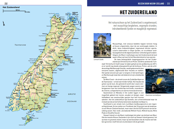Daarna nemen de auteurs u mee op reis langs de vulkanen en geisers, de subtropische regenwouden en diepe fjorden en de charmante steden tussen de smaragdgroene velden. Van Auckland tot Christchurch en van Rotorua tot de Cookeilanden. Deze hoofdstukken worden afgewisseld met thema- en wetenswaardpagina’s onder andere ‘Maori-kunst’, ‘Kunstnijverheid’, ‘Avontuurlijk sporten’, ‘de Nationale Parken’ en ‘Antarctica’. De gedetailleerde kaarten en prachtige kleurenfoto’s maken deze gids compleet. In het gedeelte ‘Reisinformatie’ vindt u alles over vervoer, accommodatie, restaurants, reisbenodigdheden, noodgevallen, gezondheid, toeristische tips, uitgaan, klimaat, winkelen, nuttige adressen en talloze andere wetenswaardigheden.