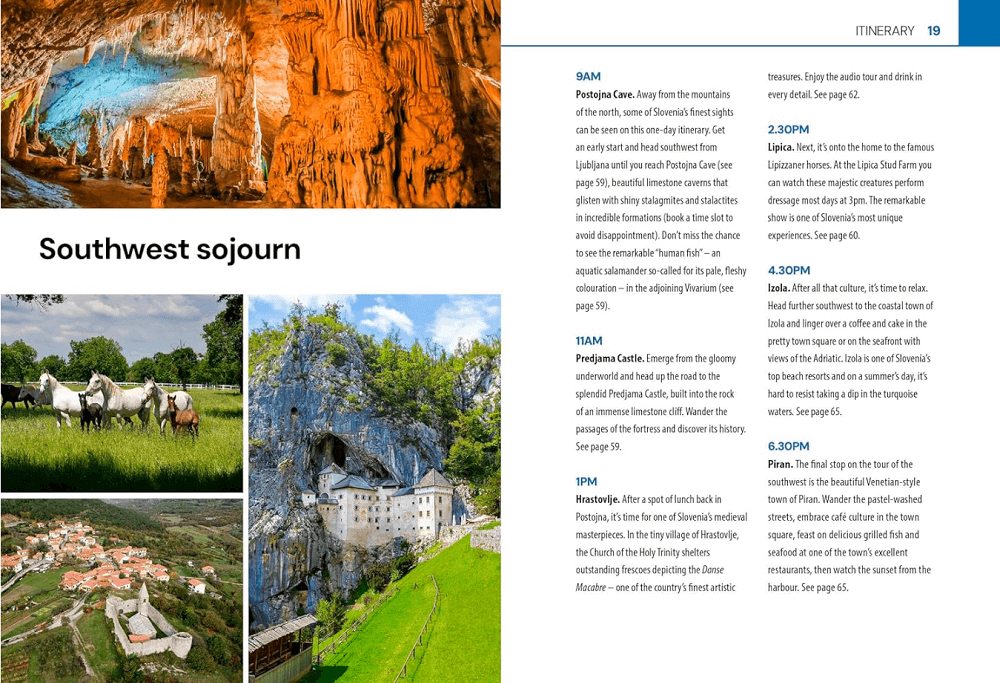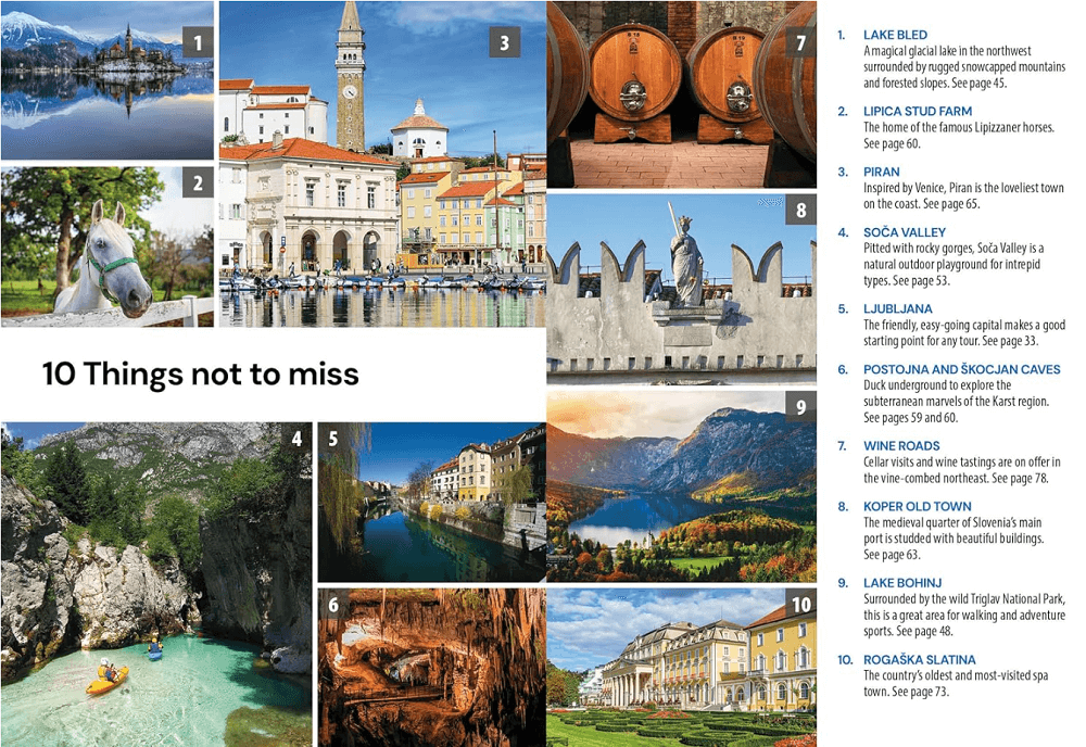 Not to miss: Lake Bled, Lipica Stud Farm, Koper Old Town, Piran, Soca Valley, Ljubljana, Postojna and škocjan caves, wineries, Lake Bohinj, Rogaška Slatina