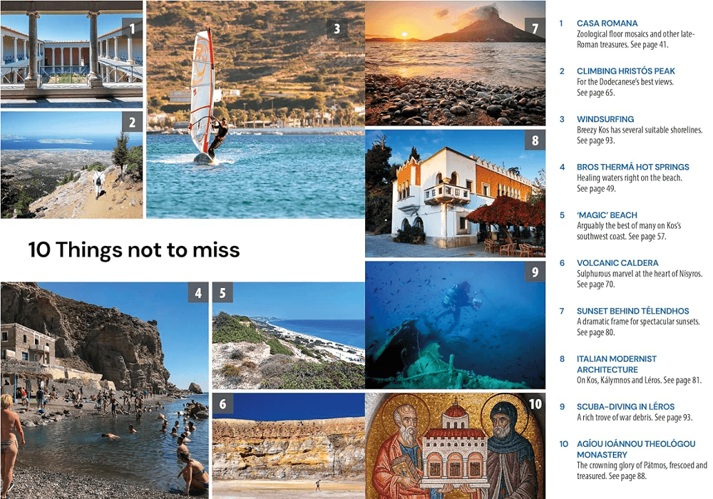 Not to miss in Kos: Casa Romana, climbing Hristos Peak, windsurfing, Bros Thermá hot springs, 'Magic' beach, volcanic Caldera, sunset behind Telendos, Italian architecture, scuba-diving in Leros, Agiou Ioannou