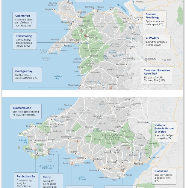 Covers: Cardiff, Brecon Beacons, Swansea, the Gower, Carmarthenshire, Pembrokeshire, Aberystwyth, Snowdonia, Angelsey and more