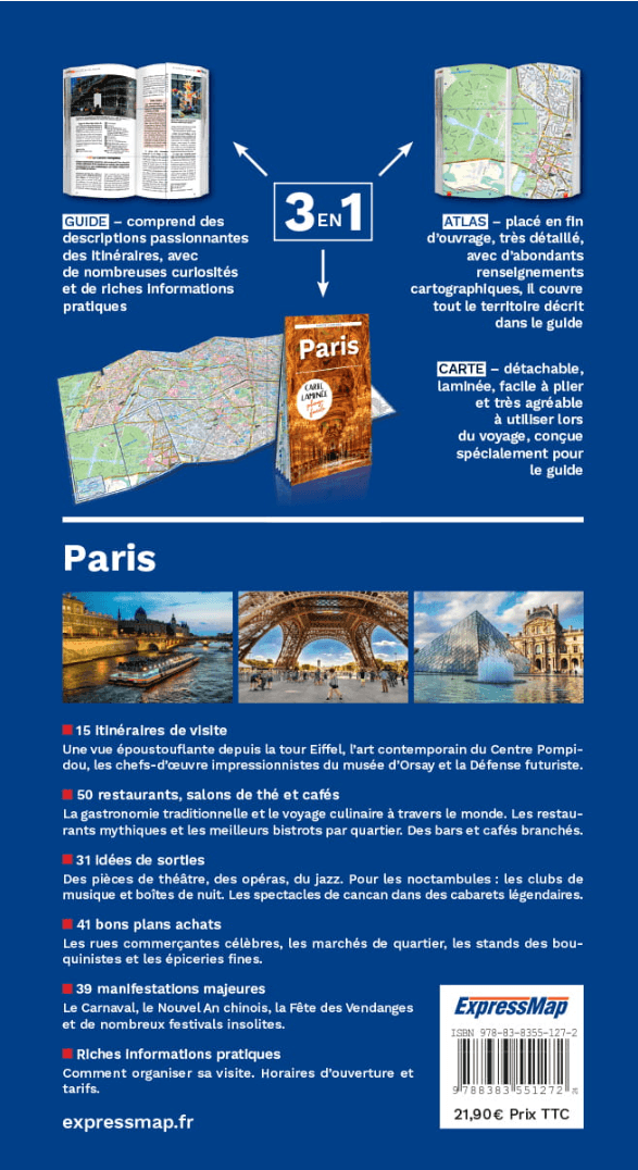 Productomschrijving: 3 in 1 - Paris (ENGELSTALIG) - A guidebook with a difference. Mapped out walking tours, a detailed city atlas and a folding laminated map – all prepared especially to complement the guidebook format. With this set, it is easy to plan your sightseeing tour, move about the city and find your way to selected sights.