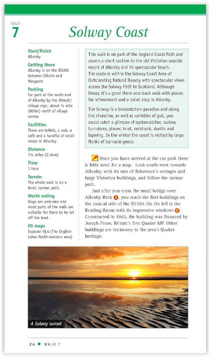 - Packed with essential information per walk: Start / finish position, travel information on how to get there, parking, toilets and refreshments stops, distance and time, terrain
