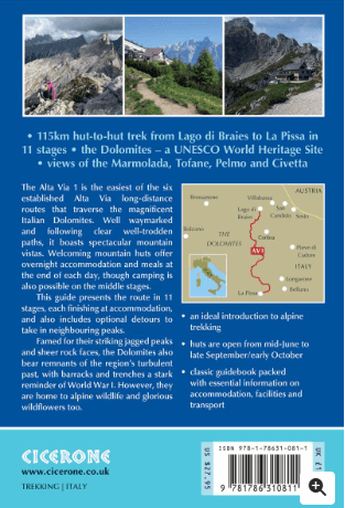 Discription: Guidebook describing the 115km Alta Via 1, a hut-to-hut long-distance trail through the magnificent Italian Dolomites. Easier than the other AV trails, the route extends from Lago di Braies to La Pissa and is described in 11 stages. It offers majestic mountain vistas, including views of the Marmolada, Pelmo and Civetta. Includes 1:25K map booklet.