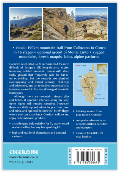 The GR20 is a challenging walk (with scrambling) through isolated mountain terrain for experienced, fit walkers; backpacking throughout.