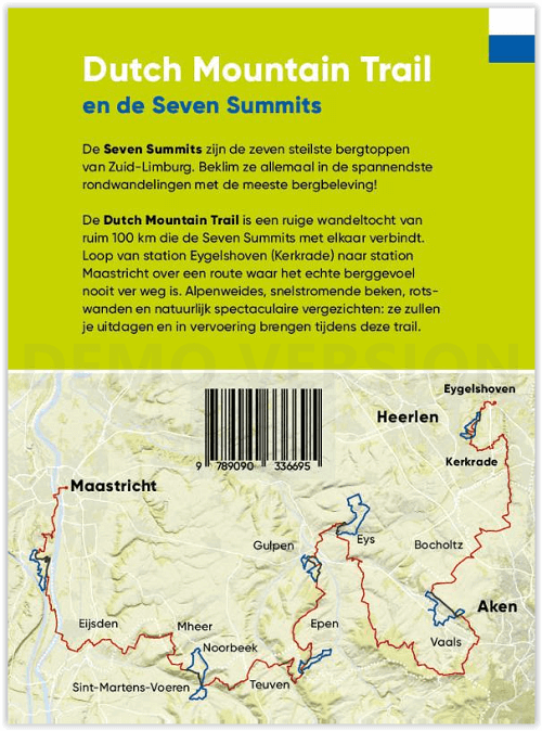Productomschrijving: De Seven Summits zijn de 7 steilste bergtoppen van Zuid-Limburg. Beklim ze allemaal in de spannendste rondwandelingen met de meeste bergbeleving! De Dutch Mountain Trail is een ruige wandeltocht van ruim 100 km die de Seven Summits met elkaar verbindt. Loop van station Eygelshoven (Kerkrade) naar station Maastricht over een route waar het echte berggevoel nooit ver weg is. Alpenweides, snelstromende beken, rots- wanden en natuurlijk spectaculaire vergezichten, ze zullen je uitdagen en in vervoering brengen tijdens deze trail.