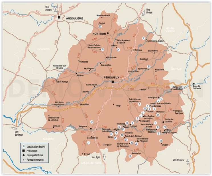 De 35 wandelingen zijn geconcentreerd in het zuidoosten van het departement, en zijn verdeeld over 8 geografische sectoren: Vézère-vallei, Lascaux, Beunes-vallei, Dordogne-vallei, Couze-vallei, Périgord Sud, Périgord Noir & Périgord Vert.