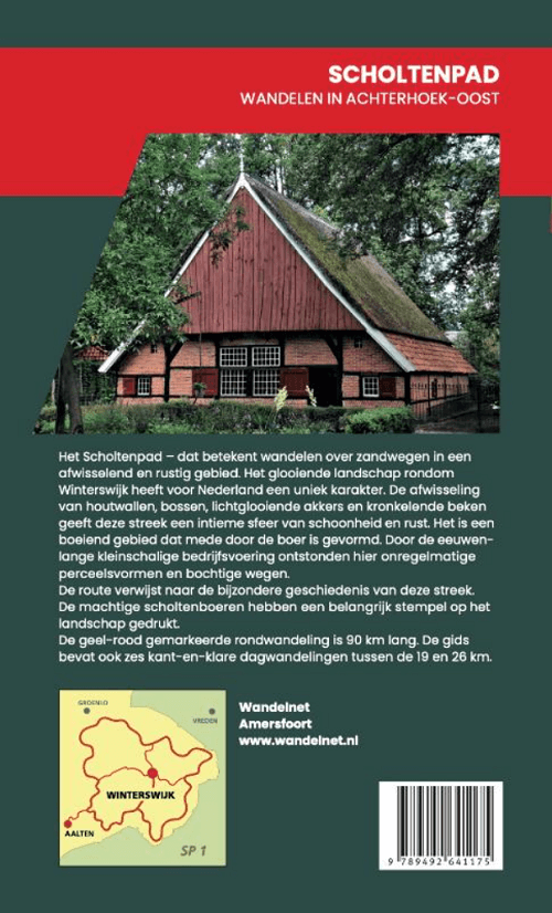 Productomschrijving: Wandelen in de Acherhoek (Oost) - Een verkenningstocht over zandwegen in een afwisselende en rustieke omgeving. Dat is het Scholtenpad. Het glooiende landschap rondom Winterswijk is een lappendeken van bos en boerenland met slingerende beekjes. Een heerlijk gebied om in te wandelen. De naam van de route verwijst naar de bijzondere geschiedenis van deze streek. De machtige Scholtenboeren hebben namelijk een belangrijke stempel op het landschap gedrukt. Er zijn vier 'inkortingroutes' tussen de spaken en het wiel van het Scholtenpad.