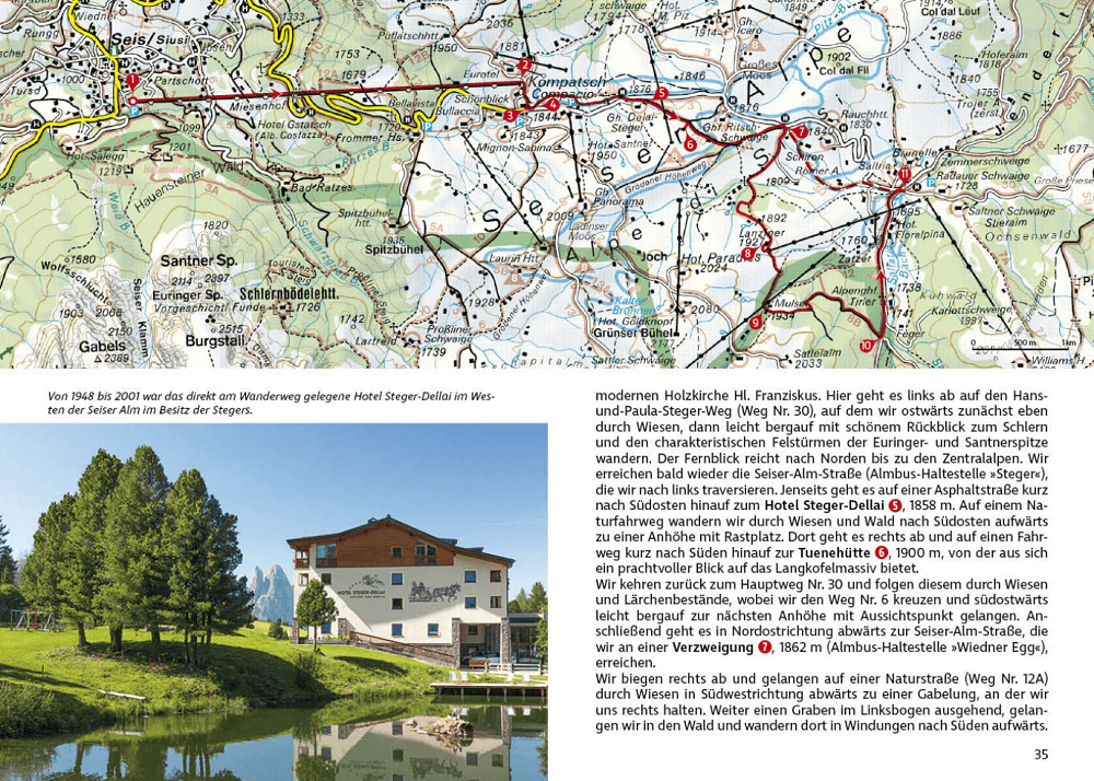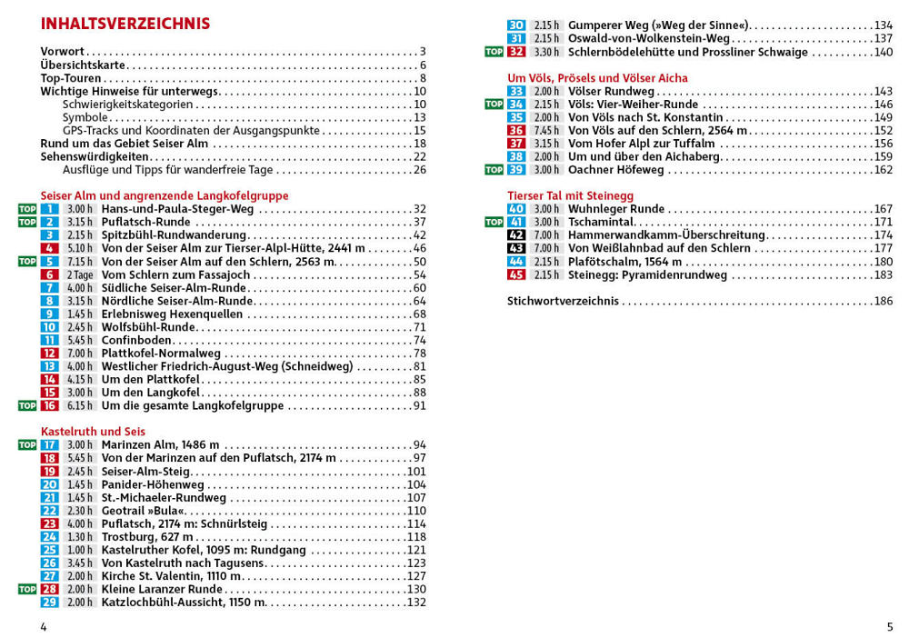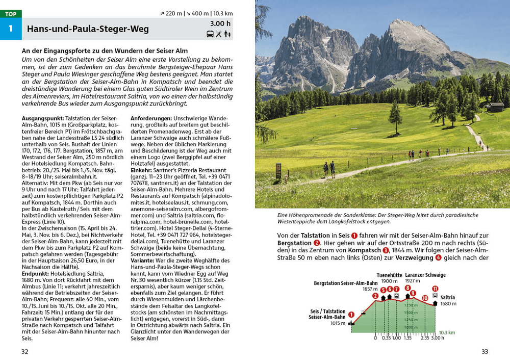 Mit höchst abwechslungsreichen und leichten Wanderungen führt der Wanderführer über die Seiser Alm. So geht es beispielsweise auf bequemen Wanderwegen auf das aussichtsreiche Plateau Puflatsch. Einfach herrlich ist die Umrundung der berühmten Dolomitenberge Langkofel und Schlern, die von allen Seiten großartige Fotomotive sind. Gepflegte Wege und Sessellifte machen den Naturgenuss auf der Seiser Alm generell leicht. Idyllisch verstreut liegen Hütten, Almen und Gasthöfe, die wunderbare Wanderziele mit feiner Einkehr und Panoramablick sind. Dass die Seiser Alm autofrei ist, macht den Landschaftsgenuss umso größer. Nur über eine Mautstraße, zwei Seilbahnen aus St. Ulrich im Grödnertal und aus Seis sowie einem Bus ist das Gebiet erreichbar.