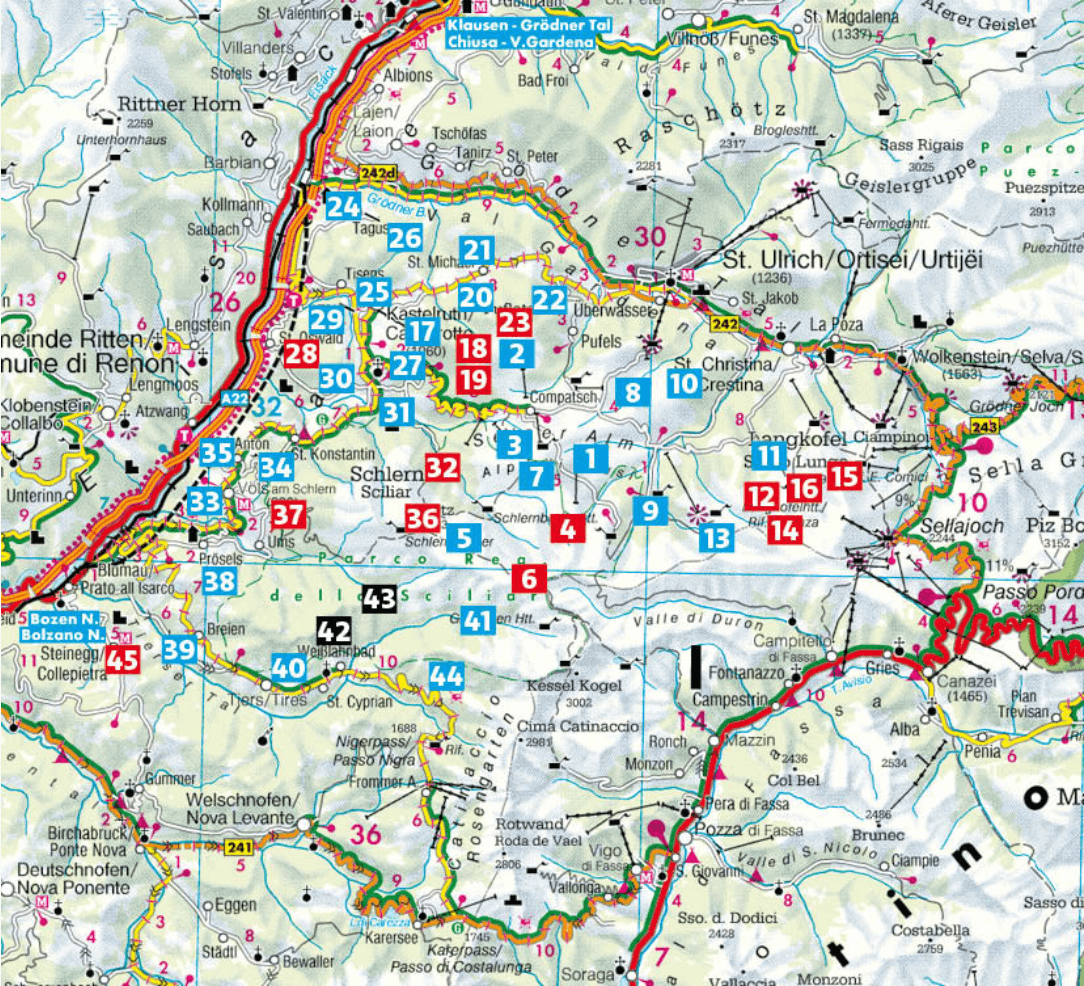 Neben der Seiser Alm stellt der Rother Wanderführer auch Wanderungen in den angrenzenden Dolomitenmassiven von Langkofel, Schlern und Rosengarten vor, zu denen der Naturpark Schlern-Rosengarten gehört. Mit dem Latemar ist dieses Gebiet eins von neun UNESCO-Welterbe-Regionen in den Dolomiten. Außerdem stellt der Rother Wanderführer herrliche Wanderungen auf »halber Höhe« im Gebiet von Völs, Seis und Kastelruth vor sowie abwechslungsreiche Spaziergänge im Eisacktal, das mit seinen wunderschönen Edelkastanien, Wein- und Obstgärten, alten Bauernhöfen und noblen Burgen besticht.