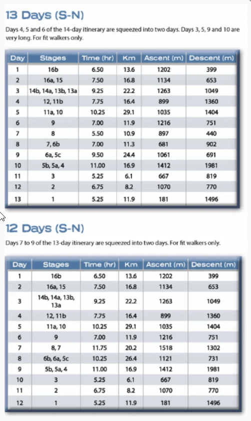 * 15 different itineraries: schedules of 9, 10, 11, 12, 13, 14, 15 and 16 days. Includes both northbound and southbound itineraries. Difficult calculations of time, distance and altitude gain are done for you.