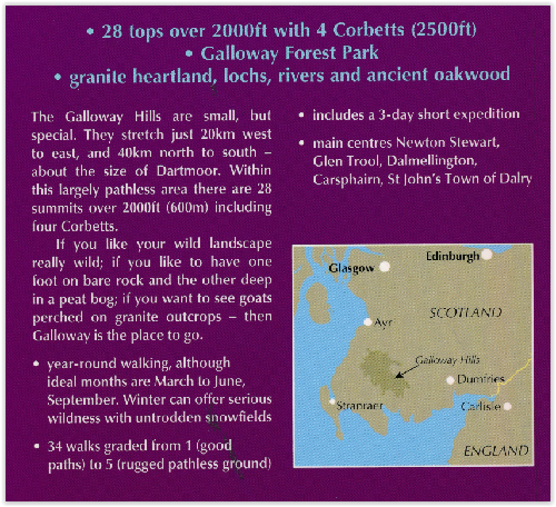De wandelingen omvatten onder meer de suggestieve gebieden van The Merrick, The Awful Hand, The Rhinns of Kells, de Minnigaff Hills en Cairnsmore of Fleet. De gids gebruikt OS 1: 50.000 kaarten met gedetailleerde wegbeschrijvingen en inspirerende foto's. Belangrijke informatie zoals afstand, tijd en opstijging worden gegeven. Een 'hardheid' cijfer geeft een indicatie aan van hoe ruw de grond naar verwachting zal zijn, en suggesties van varianten, en manieren om de route uit te breiden. Er wordt veel achtergrondinformatie gegeven over de fascinerende en belangrijke geschiedenis van de regio.