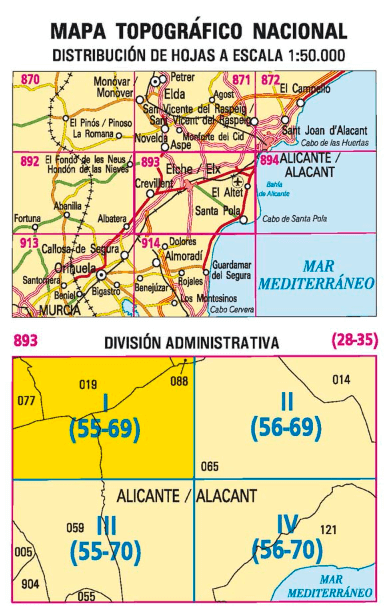 Wandelkaarten Elche of Elx (gemeente) Alicante, Valencia Spanje en Alicante (provincie) Valencia Spanje van Centro Nacional de Informacion Geografica. Ideaal voor tochten in Spanje.