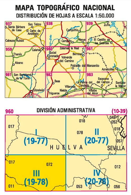 Wandelkaarten Valverde del Camino (gemeente) Huelva, Andalusië Spanje en Huelva (provincie) Andalusië, Spanje van Centro Nacional de Informacion Geografica. Ideaal voor tochten in Spanje.