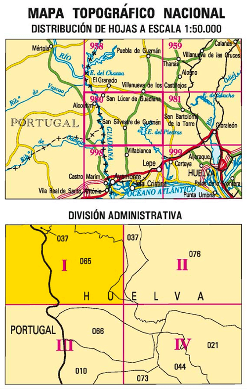 Wandelkaarten Sanlúcar de Guadiana (gemeente) Huelva, Andlusië Spanje en Huelva (provincie) Andalusië, Spanje van Centro Nacional de Informacion Geografica. Ideaal voor tochten in Spanje.