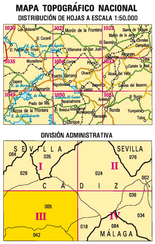 Wandelkaarten Algodonales (gemeente) Cadiz, Andalusië Spanje en Cadiz (provincie) Andalusië Spanje van Centro Nacional de Informacion Geografica. Ideaal voor tochten in Spanje.