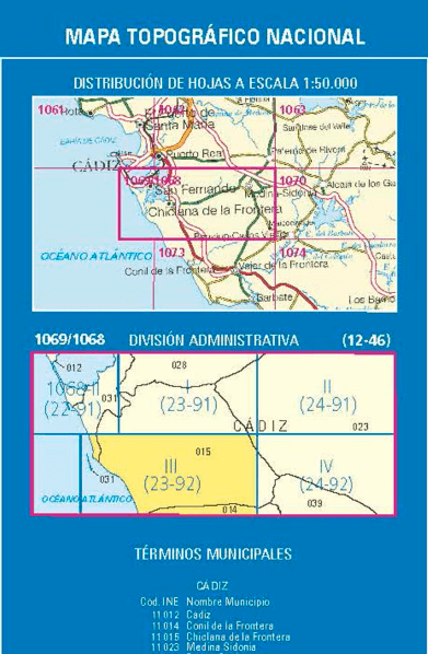 Wandelkaarten Sancti Petri-La Barrosa (gemeente) Cadiz, Andalusië Spanje en Cadiz (provincie) Andalusië Spanje van Centro Nacional de Informacion Geografica. Ideaal voor tochten in Spanje.