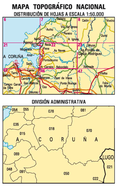 Wandelkaarten Pontedeume (gemeente) A Coruna, Galicië Spanje en A Coruña (provincie) Galicië Spanje van Centro Nacional de Informacion Geografica. Ideaal voor tochten in Spanje.