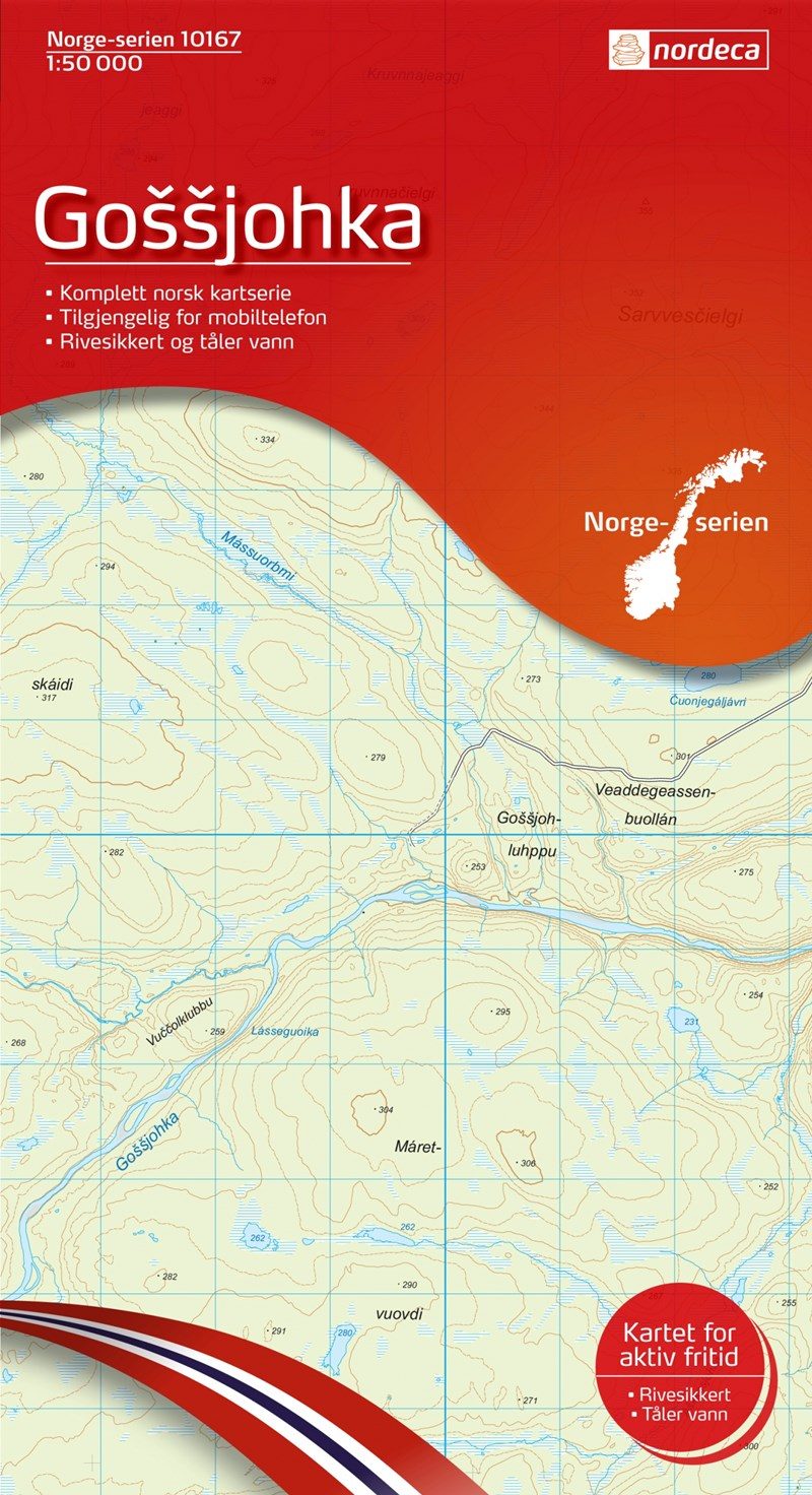 Productomschrijving: Gossjohka Nature Reserve is een beschermd natuurgebied in Karasjok gemeente. Het reservaat heeft een oppervlakte van 1.284 km², waarvan rivier Gossjohka uitmondt in Anarjohka. Nordeca AS is actief in geografische informatiesystemen voor de professionele markt en heeft een breed assortiment aan gedrukte en digitale kaarten voor de consumentenmarkt. Ons merk weerspiegelt onze sterke Scandinavische wortels en lange geschiedenis als leverancier van geografische diensten.
