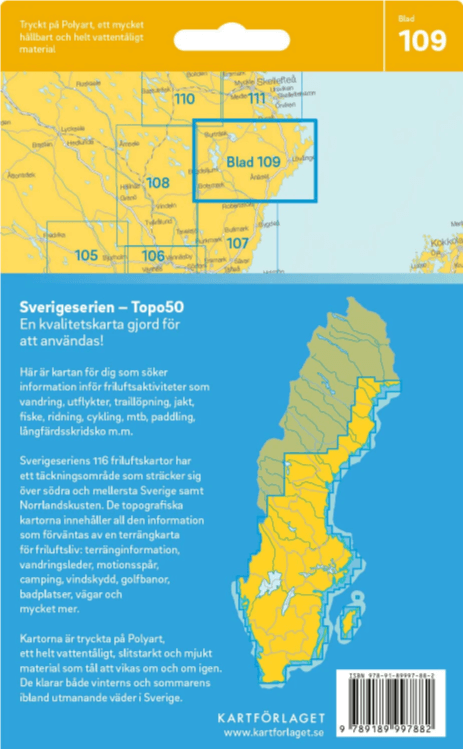 Een belangrijk kenmerk van de Sverigeserien is het duurzame materiaal. De kaarten zijn afgedrukt op waterafstotend en scheurvast synthetisch papier, waardoor ze bestand zijn tegen regen, wind en intensief gebruik. Ze zijn bovendien dubbelzijdig gedrukt, waardoor een groter gebied wordt weergegeven zonder in te boeten aan draagbaarheid.