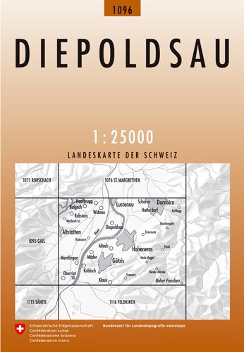 Wandelkaart Diepoldsau - Sankt-Gallen Zwitserland - Swisstopo Productomschrijving: Kaart 1096 - Deze ligt vlak aan het Schattenwald, Rotwald en het Dürrenbergwald - Diepoldsau is een gemeent...