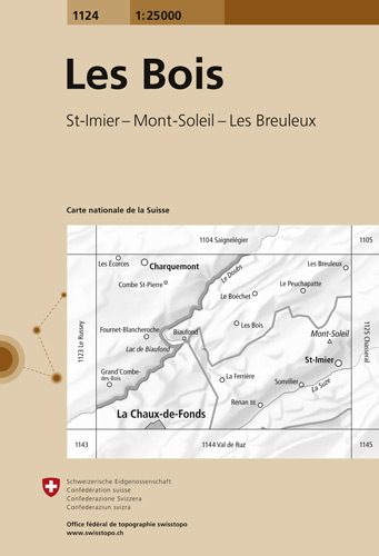 Wandelkaart Les Bois - Jura Zwitserland - Swisstopo Productomschrijving: Kaart 1124 - Gelegen in het middan van Parc Naturel du doubs en Parc régional Chasseral - Les Bois is een gemeente en...