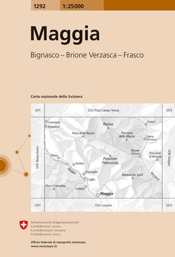 Wandelkaart Maggia - Ticino Zwitserland - Swisstopo Productomschrijving: Kaart 1292 - Een omgeving, die ver van nergens ligt, die aanpaalt aan het Bosco Gurin, Bosco della Fiara en Bosco del...