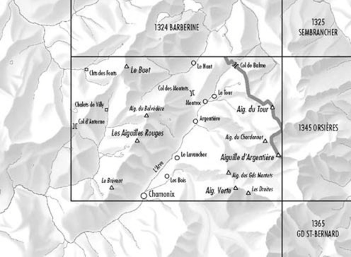 Productomschrijving: Kaart 1344 - Gelegen in de directe omgeving van de Mont Blanc op het drie landen punt. In de zelfde omgeving is ook Col de Croix de Fer te vinden, die deel uitmaakt van de TMB